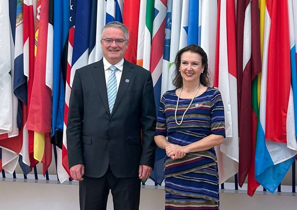 El Secretario General de la OCDE, Mathias Cormann, y la Canciller argentina, Diana Mondino. Fuente: Comunicado de prensa del Ministerio de Relaciones Exteriores, Comercio Internacional y Culto de la República Argentina